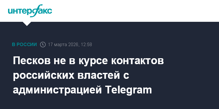 Москва. 17 марта. INTERFAX.RU - Кремлю неизвестно о каких-либо контактах российских властей с администрацией Telegram по вопросу блокировки мессенджера в стране, заявил на брифинге пресс-секретарь президента Дмитрий Песков.