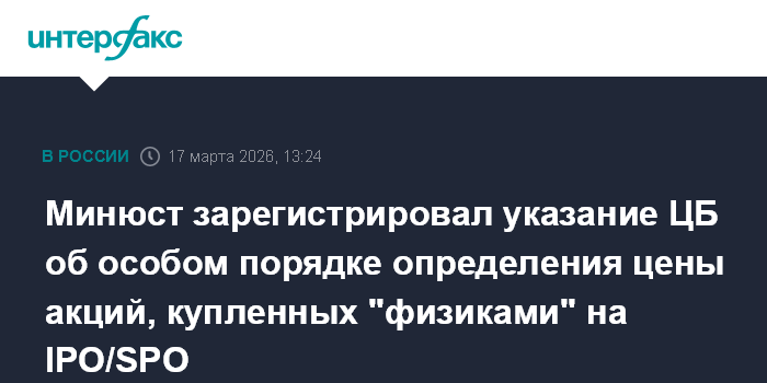 Минюст зарегистрировал указание ЦБ об особом порядке определения цены акций, купленных "физиками" на IPO/SPO