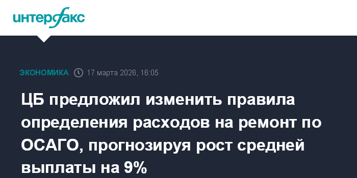 Москва. 17 марта. INTERFAX.RU - Банк России предлагает изменить правила определения расходов на ремонт по ОСАГО с учетом рыночной ситуации, в результате выплаты по ОСАГО возрастут, прогнозирует Центробанк в сообщении, распространенном во вторник.
