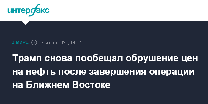 Москва. 17 марта. INTERFAX.RU - Президент США Дональд Трамп во вторник вновь выразил мнение, что по завершении боевых действий на Ближнем Востоке последует резкое снижение цен на нефть.