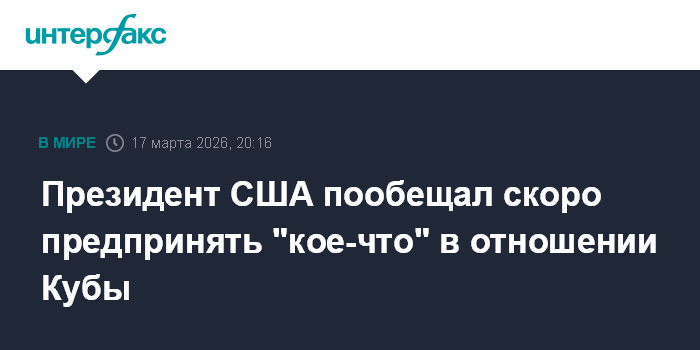 Москва. 17 марта. INTERFAX.RU - Президент США Дональд Трамп заявил во вторник, что Вашингтон в скором времени предпримет некоторые меры в отношении Кубы.