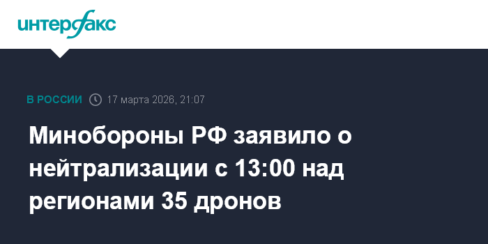 Москва. 17 марта. INTERFAX.RU - Российские военные с 13:00 до 20:00 вторника перехватили и уничтожили 35 украинских беспилотников, сообщило Минобороны РФ.