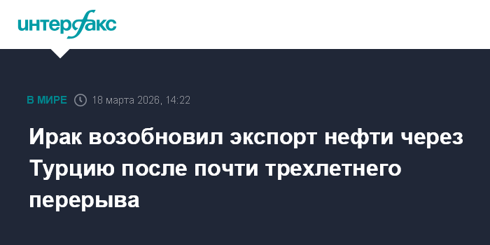 Москва. 18 марта. INTERFAX.RU - Иракская государственная компания North Oil Company объявила о возобновлении поставок нефти с месторождений в Киркуке в турецкий порт Джейхан после почти трехлетнего перерыва, сообщает агентство "Анадолу".