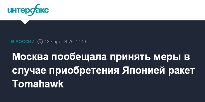 Москва. 18 марта. INTERFAX.RU - Россия примет компенсирующие меры для обеспечения своей безопасности в связи с поставками в Японию американских крылатых ракет Tomahawk, заявила официальный представитель МИД РФ Мария Захарова.