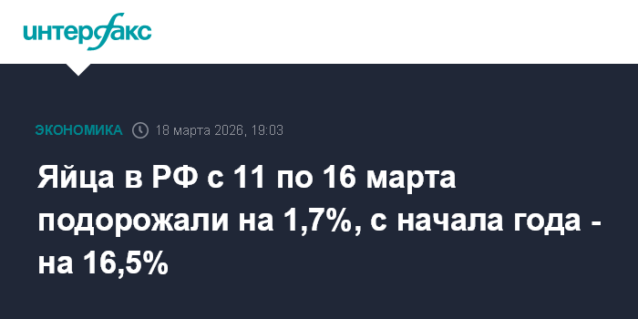 За предыдущий период с 3 по 10 марта (восемь дней из-за дополнительного выходного) цены повысились на 3%. С начала года яйца подорожали на 16,5%.
