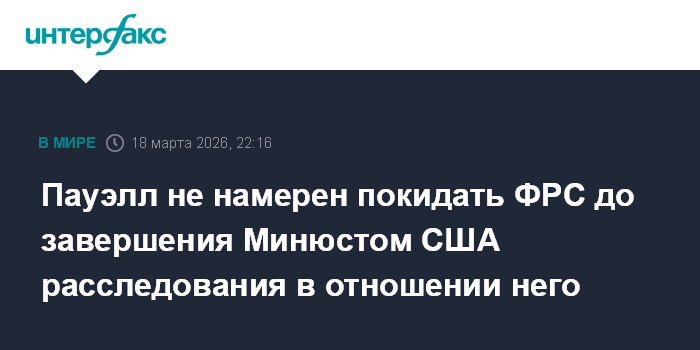 Москва. 18 марта. INTERFAX.RU - Председатель Федеральной резервной системы (ФРС) Джером Пауэлл заявил на пресс-конференции по итогам заседания Федрезерва в среду, что не намерен покидать совет управляющих американского ЦБ до завершения Минюстом США расследования в отношении него.