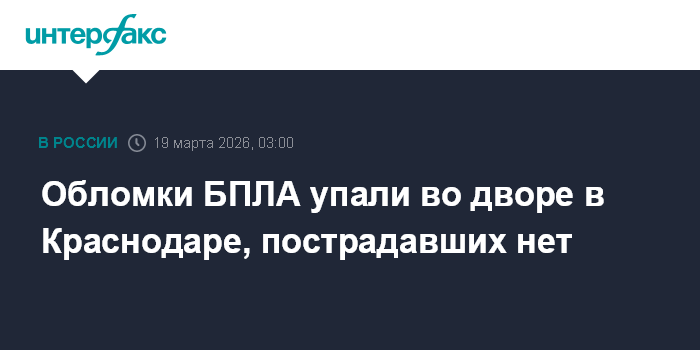 Москва. 19 марта. INTERFAX.RU - Фрагменты БПЛА упали во дворе многоэтажной застройки в Прикубанском округе Краснодара, предварительно, никто не пострадал, сообщили в оперативном штабе Краснодарского края со ссылкой на главу города Евгения Наумова.