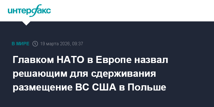 Москва. 19 марта. INTERFAX.RU - Присутствие бронетанковых бригад США в Польше имеет решающее значение для сдерживания, при этом Европа не будет способна самостоятельно обеспечить свою оборону до 2035 года, заявил верховный главнокомандующий Объединенными вооруженными силами НАТО в Европе Алексус Гринкевич. Об этом сообщают польские СМИ.