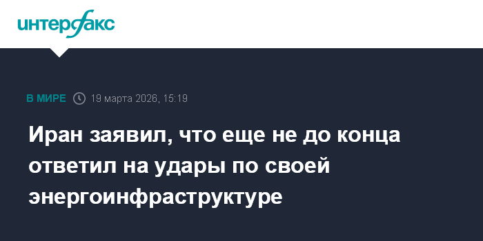 Москва. 19 марта. INTERFAX.RU - Иран еще не завершил свой ответ на удары по его энергетической инфраструктуры, передает агентство "Тасним" со ссылкой на представителя центрального штаба ВС страны "Хатам аль-Анбия".