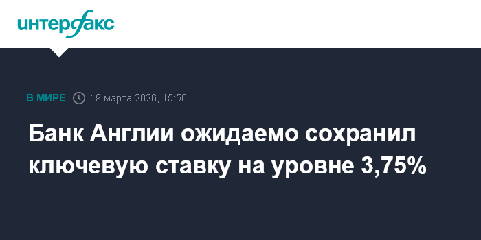 Москва. 19 марта. INTERFAX.RU - Банк Англии сохранил ключевую процентную ставку на уровне 3,75% годовых, говорится в сообщении британского ЦБ.