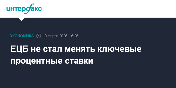Москва. 19 марта. INTERFAX.RU - Европейский центральный банк (ЕЦБ) сохранил основные процентные ставки на прежних уровнях по итогам мартовского заседания, завершившегося в четверг.