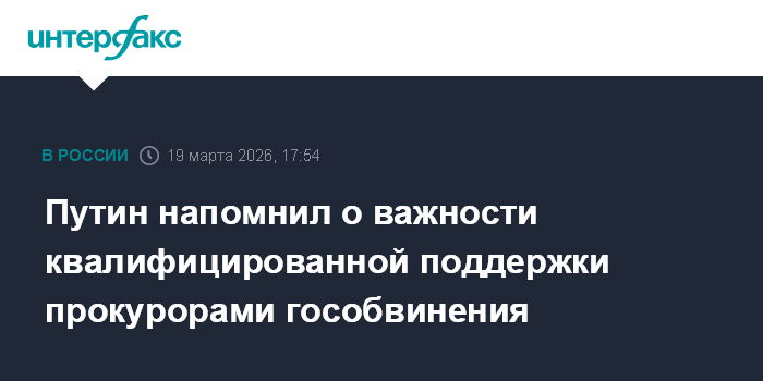 Москва. 19 марта. INTERFAX.RU - Президент РФ Владимир Путин назвал одной из важнейших задач прокуроров грамотное поддержание государственного обвинения в судах как залога справедливого и обоснованного судебного приговора.