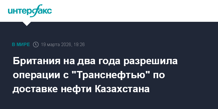 Москва. 19 марта. INTERFAX.RU - Минфин Великобритании (OFSI) выдал лицензию на осуществление операций с подсанкционой "Транснефтью" по поставке, покупке, транспортировке или доставке нефти Казахстана с 19 марта до 18 марта 2028 года, сообщило ведомство.