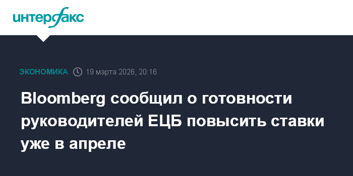 Москва. 19 марта. INTERFAX.RU - Члены руководства Европейского центрального банка (ЕЦБ) будут готовы повысить основные процентные ставки уже в апреле, если к этому времени скачок цен на энергоносители приведет к ощутимому ускорению инфляции в еврозоне, пишет Bloomberg со ссылкой на информированные источники.