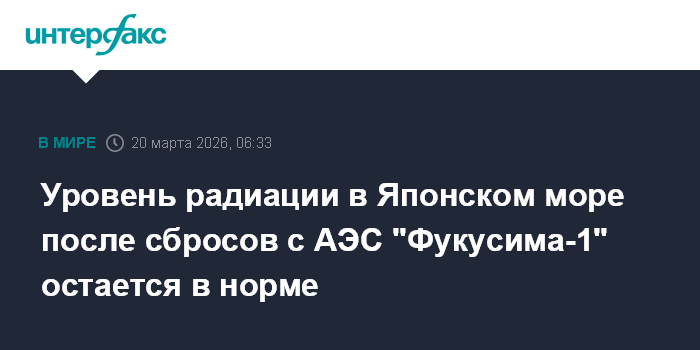 Москва. 20 марта. INTERFAX.RU - Первые в этом году исследования содержания радионуклидов в воде и рыбе из Японского моря, проведенные в связи со сбросом воды в 2023 году с АЭС "Фукусима-1", показали соответствие проб нормативам, сообщили "Интерфаксу" в пресс-службе управления Роспотребнадзора по Приморскому краю.