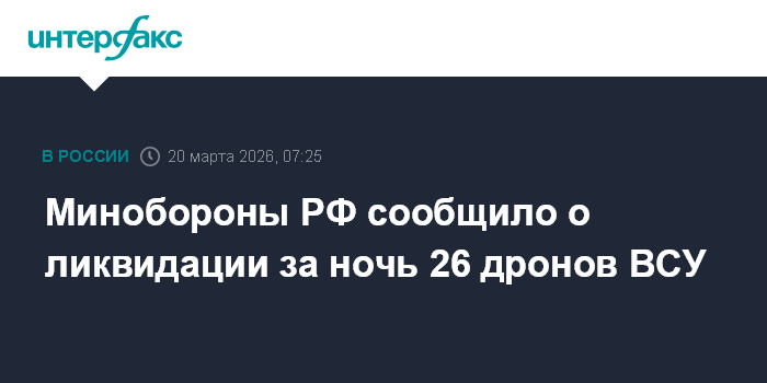 Москва. 20 марта. INTERFAX.RU - Российские военные минувшей ночью перехватили и уничтожены 26 украинских беспилотников, сообщило Минобороны РФ.