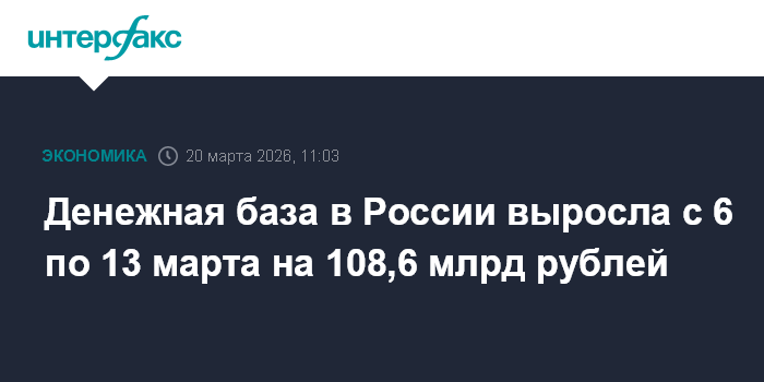 На 6 марта денежная база в России равнялась 19812,8 млрд рублей. Таким образом, за период она выросла на 0,55%, или на 108,6 млрд рублей.