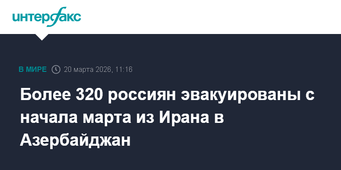 Москва. 20 марта. INTERFAX.RU - Из Ирана в Азербайджан со 2 марта эвакуированы 323 гражданина России, сообщили в пятницу азербайджанские СМИ.