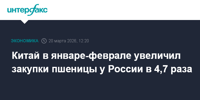 Москва. 20 марта. INTERFAX.RU - Китай в январе-феврале 2026 года импортировал из России пшеницы на $5,98 млн, что в 4,7 раза больше, чем годом ранее ($1,27 млн), сообщается в материалах Государственного таможенного управления (ГТУ) КНР.