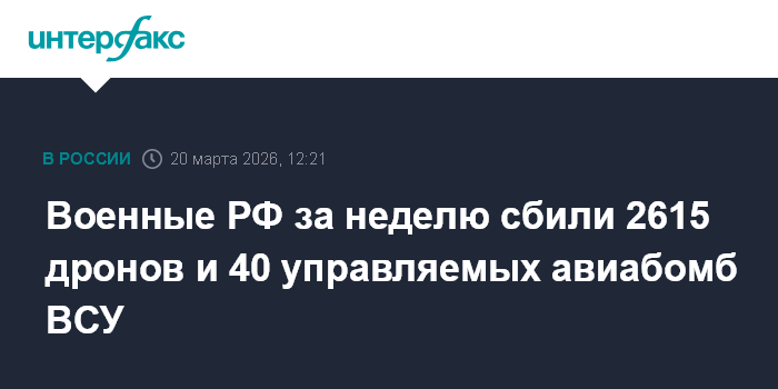 Москва. 20 марта. INTERFAX.RU - Российские средства ПВО за неделю сбили 2615 беспилотников, сообщает министерство обороны РФ.