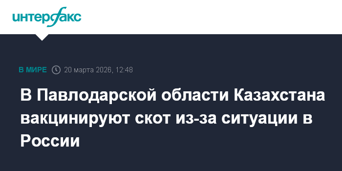 Москва. 20 марта. INTERFAX.RU - В Павлодарской области Казахстана, граничащей с Россией, начали прививать домашний скот в связи с заболеваемостью животных в российских соседних регионах, сообщил журналистам в кулуарах парламента вице-премьер республики Канат Бозумбаев.
