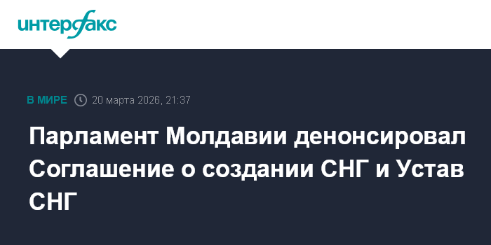 Москва. 20 марта. INTERFAX.RU - Депутаты парламента Молдавии на заседании в пятницу проголосовали за денонсацию Соглашения о создании Содружества Независимых Государств и Устава СНГ.