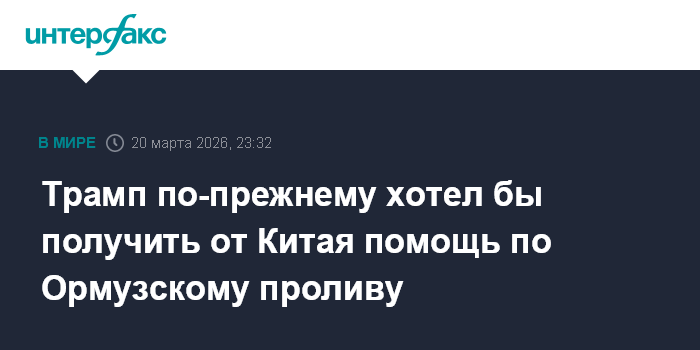 Москва. 20 марта. INTERFAX.RU - Таким странам, как Китай, следовало бы помочь в восстановлении безопасного судоходства через Ормузский пролив, заявил в пятницу президент США Дональд Трамп.