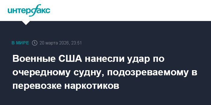 Москва. 20 марта. INTERFAX.RU - Американские военные нанесли удар по судну, которое, по версии разведки США, перевозило наркотики в восточной части Тихого океана, сообщило Южное командование ВС США (SOUTHCOM).