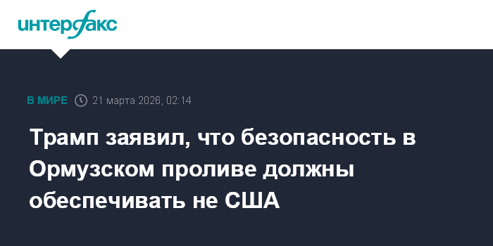 Москва. 21 марта. INTERFAX.RU - Безопасное судоходство в Ормузском проливе в будущем должны обеспечивать не США, а те страны, чьи экономики в этом заинтересованы в этой транспортной артерии, заявил американский президент Дональд Трамп.