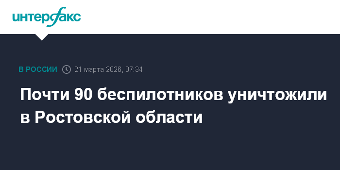 Москва. 21 марта. INTERFAX.RU - В Ростовской области в субботу отразили атаку почти 90 БПЛА в девяти районах региона, сообщил губернатор Юрий Слюсарь.