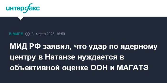 Москва. 21 марта. INTERFAX.RU - В МИД России считают, что ООН и МАГАТЭ должны дать объективную оценку американо-израильскому удару по иранскому ядерному центру в Натанзе.