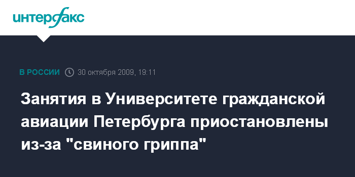 Санкт-Петербург. 30 октября. INTERFAX.RU - В Санкт-Петербургском университете гражданской авиации приостановлены занятия из-за случаев "свиного гриппа", сообщили "Интерфаксу" в медико-санитарной части вуза.