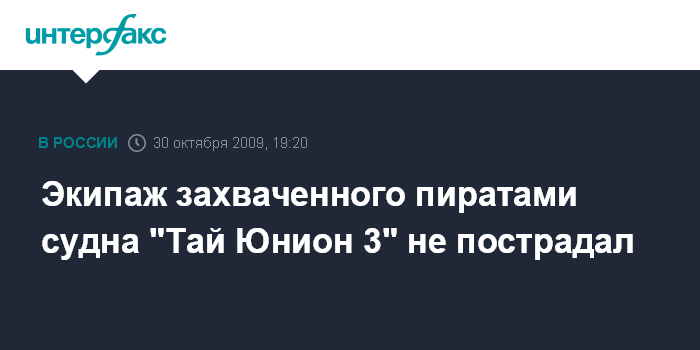 29 октября в Индийском океане в 200 морских милях к северу от Сейшельских островов сомалийскими пиратами было захвачено рыболовецкое судно "Тай Юнион 3" под флагом Таиланда. Подтверждена информация о наличии в составе команды судна российских граждан. Получен список членов экипажа, согласно которому на борту находятся 23 российских моряка, а также по два гражданина Филиппин и Ганы, говорится в сообщении МИД Р.