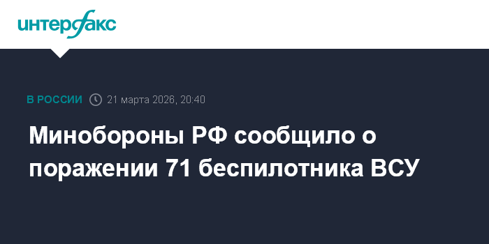 Москва. 21 марта. INTERFAX.RU - Российские военные сообщили, что с 14:00 до 20:00 в субботу дежурными средствами ПВО перехвачен и уничтожен 71 украинский беспилотный летательный аппарат самолетного типа.