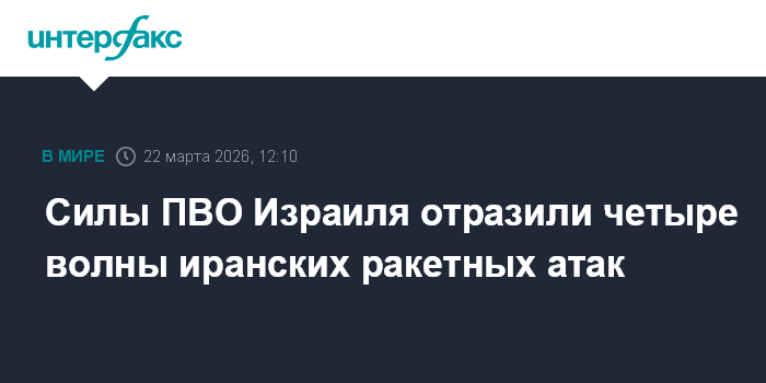 Москва. 22 марта. INTERFAX.RU - Израильские средства противовоздушной обороны в субботу утром перехватили несколько баллистических ракет, запущенных Ираном, сообщила Армия обороны Израиля (ЦАХАЛ).