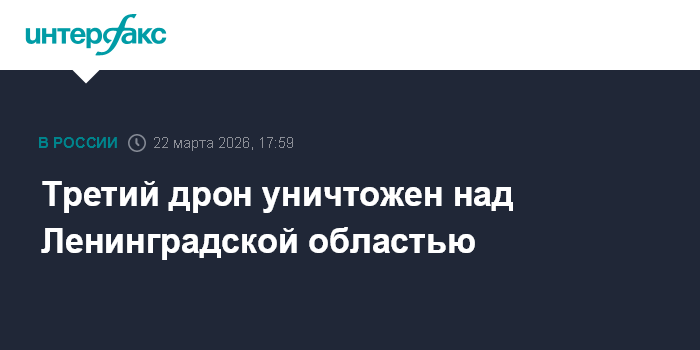 Москва. 22 марта. INTERFAX.RU - Третий беспилотник ликвидирован на территории Ленинградской области в воскресенье, сообщил губернатор региона Александр Дрозденко.