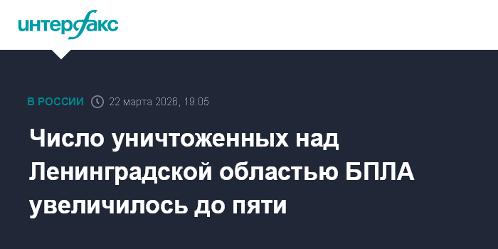 Москва. 22 марта. INTERFAX.RU - Пять беспилотников ликвидированы на территории Ленинградской области в воскресенье, сообщил губернатор региона Александр Дрозденко.
