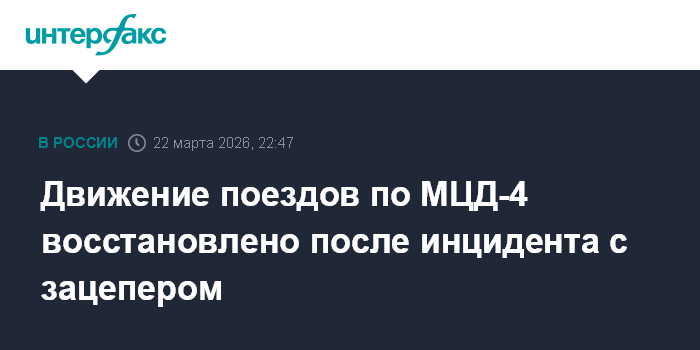 Москва. 22 марта. INTERFAX.RU - Движение поездов четвертой линии Московских центральных диаметров (МЦД-4, D4) на участке "Москва-Белорусская - Марьина Роща" восстановлено после сбоя из-за травмирования зацепера, сообщили в Московской железной дороге (МЖД).