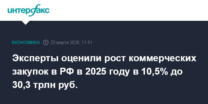 Москва. 23 марта. INTERFAX.RU - Объем коммерческих закупок в России в 2025 году вырос на 10,5% до 30,3 трлн рублей с 27,4 трлн рублей годом ранее. Об этом говорится в исследовании АО "B2B-РТС" (головная компания группы, в которую входят операторы двух электронных торговых площадок и разработчики решений и сервисов в области закупок).