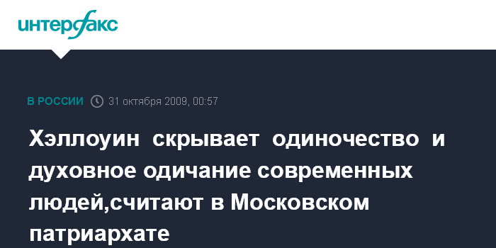 Москва. 31 октября. ИНТЕРФАКС - В Московском патриархате считают, что за популярностью Хэллоуина кроется глубокое духовное одиночество и внутренняя тоска современного человека.