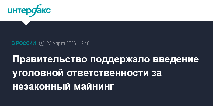Москва. 23 марта. INTERFAX.RU - Правительство подготовило к внесению в Госдуму законопроект о введении уголовной ответственности за незаконный майнинг цифровой валюты и незаконное осуществление деятельности оператора майнинговой инфраструктуры, если эти деяния причинили крупный ущерб гражданам, организациям или государству либо сопряжены с извлечением дохода в крупном размере.