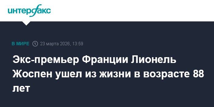 Москва. 23 марта. INTERFAX.RU - Видный политик-социалист Лионель Жоспен, занимавший пост премьер-министра Франции в 1997-2002 годах, скончался в возрасте 88 лет, сообщают в понедельник французские СМИ.