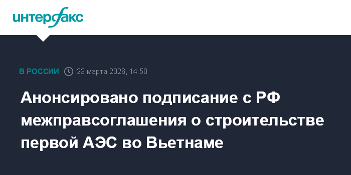 Москва. 23 марта. INTERFAX.RU - Межправительственное соглашение о строительстве первой атомной электростанции во Вьетнаме будет подписано по итогам переговоров в понедельник, заявил председатель правительства России Михаил Мишустин на переговорах с премьер-министром Вьетнама Фам Минь Тинем.