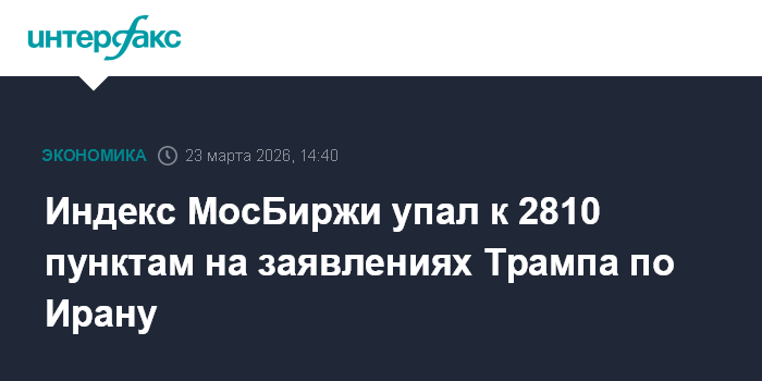 Москва. 23 марта. INTERFAX.RU - Российский рынок акций днем ускорил падение вслед за обвалившимися котировкми нефти (фьючерс на Brent торгуется ниже $100 за баррель) после заявлений президента США Дональда Трампа о продуктивных контактах США с Ираном по поводу прекращения конфликта. Индекс МосБиржи откатился до 2810 пунктов, уровня 2,5-недельной давности (4 марта).