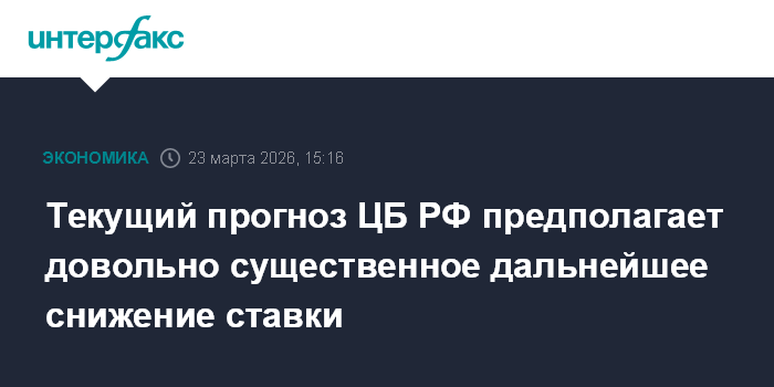 Москва. 23 марта. INTERFAX.RU - Текущий прогноз ЦБ РФ предполагает довольно существенное дальнейшее снижение ключевой ставки, заявил зампред Банка России Алексей Заботкин на заседании комитета Госдумы по финансовому рынку.