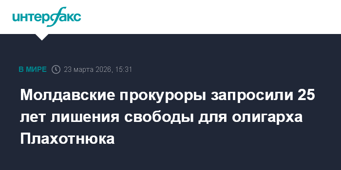 Москва. 23 марта. INTERFAX.RU - В Молдавии прокуроры запросили 25 лет лишения свободы для олигарха Владимира Плахотнюка. Запрос обвинения зачитал в понедельник на заседании суда Кишинева прокурор по делу Александр Черней.