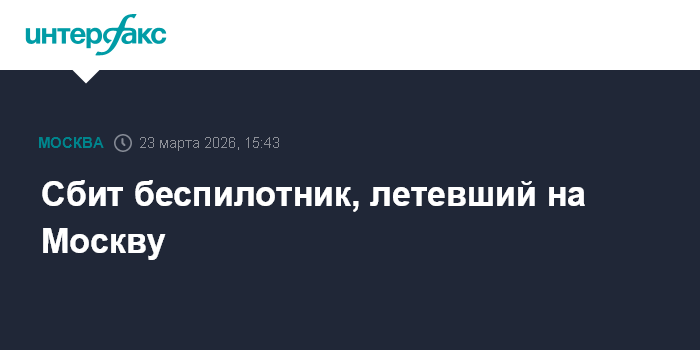 Сбит беспилотник, летевший на Москву Москва. 23 марта. INTERFAX.RU - Мэр Москвы Сергей Собянин сообщил об одном сбитом БПЛА, летевшем на столицу. В своем канале в Мах он уточнил, что специалисты экстренных служб работают на месте падения обломков.