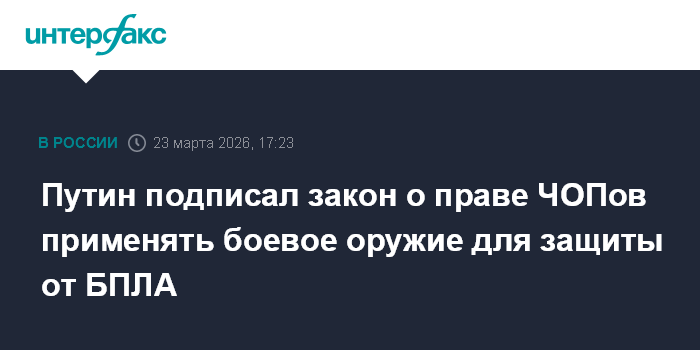 Москва. 23 марта. INTERFAX.RU - Президент РФ Владимир Путин подписал закон о предоставлении права специализированным частным охранным организациям получать в Росгвардии боевое стрелковое оружие для защиты охраняемых объектов от беспилотников.