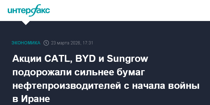 Москва. 23 марта. INTERFAX.RU - Акции ведущих китайских производителей аккумуляторов и оборудования для хранения энергии CATL, BYD и Sungrow с начала войны в Иране подорожали сильнее, чем бумаги крупнейших нефтепроизводителей, пишет Financial Times.