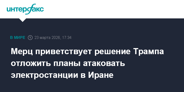 Москва. 23 марта. INTERFAX.RU - Канцлер Германии Фридрих Мерц выразил удовлетворение в связи с решением президента США Дональда Трампа отложить планы нанесения ударов по иранской энергетической инфраструктуре.